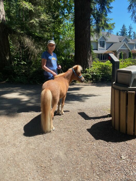 Undoubtedly, some of the most fun the SAFE horses have on a beautiful, sunny day is a trail ride or walk in Farrel McWhirter Park; and the SAFE mini horse ambassadors, Shasta and Sunny, are no exceptions. Shasta and Sunny are often invited to join their bigger counterparts and bring up the rear of the parade of SAFE horses meandering through the Park. Afterall and arguably, Shasta and Sunny have two of the cutest and fluffiest “rears” at SAFE!