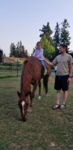 We caught up with Sophie and Julie in January 2023. Sophie has two pasture mates, Julie’s daughter’s pony and Piper, another SAFE alumni. Sophie gets a lot of groundwork but there isn’t a lot of time for as much riding anymore, as Julie has a 2‑year-old human to wrangle. Sophie is getting lots of love and attention and massages!