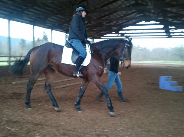 We also had one of our newer volunteers Victoria ride Lucky for the first time in a lesson. Lucky however, was having a “Thoroughbred day” — his brain was simply not in the game today and he was fidgety, agitated, and unable to concentrate. Lunging settled him temporarily, but he got worked up again when Victoria got on and most of the lesson was spent just trying to get him to relax and go forward. She did a nice job with him and got some nice moments with him (see photos below), but he never really settled down. Afterwards, we took his tack off and he rolled…and rolled…and rolled! Then he ran around like a maniac and we couldn’t catch him for some time and by that time he was lathered with sweat. Silly boy! He certainly didn’t make the best impression on Victoria, who is one of his biggest fans and was so excited to ride him, but it was truly out of character for him and I am chalking it up to not having turnout outside of his paddock for a few days as well as being very itchy as he has started shedding and I think all he was thinking about was rolling most of the lesson.
