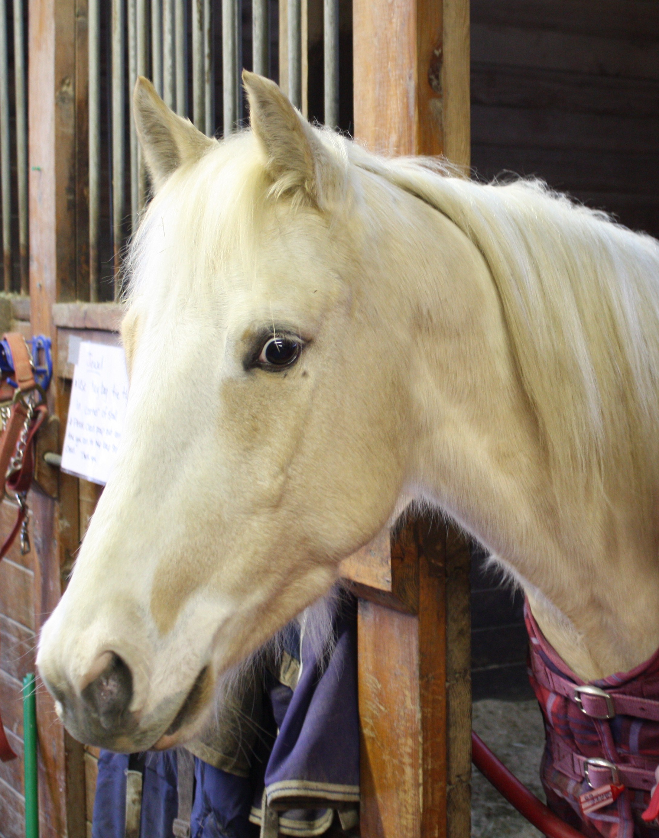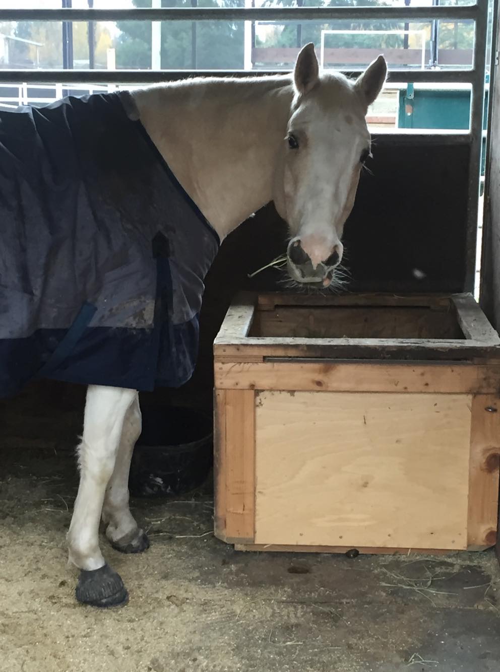 You can probably imagine my response to the call that Jewel had been injured. At first I was worried that she was hurt, then hearing the treatment plan I was quickly thinking: oh no what are we going to have on our hands?!? I am very pleased to report that she has been a little angel in her stall. She is more of a cuddle bunny than ever before and very very happy to see everyone. You really can’t help stopping to say hi when you hear that soft knicker behind the stall door. She is quiet and calm all day with the busy barn life going on around her. I personally think she may be under the impression that she is at a spa. Deep bedded stall, room service and daily visits from her hair and grooming specialists. While grooming and braiding her hair, Jewel has a relaxed soft eye. I’ll have to say she is the absolute cleanest looking horse in the barn! We did try a few toys hanging in the stall but she really wasn’t too interested in them and she seems very content looking out her window and nibbling from her hay bag.