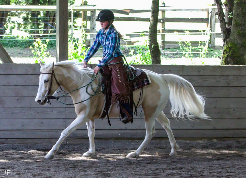 Claire has done an absolute AMAZING job training Jewel for SAFE. Our little palomino paint has transformed into a beautiful young riding mare with a TON of potential. Claire had a few things to tell us about the progress Jewel has made and riding her in last month’s Joel Conner clinic: