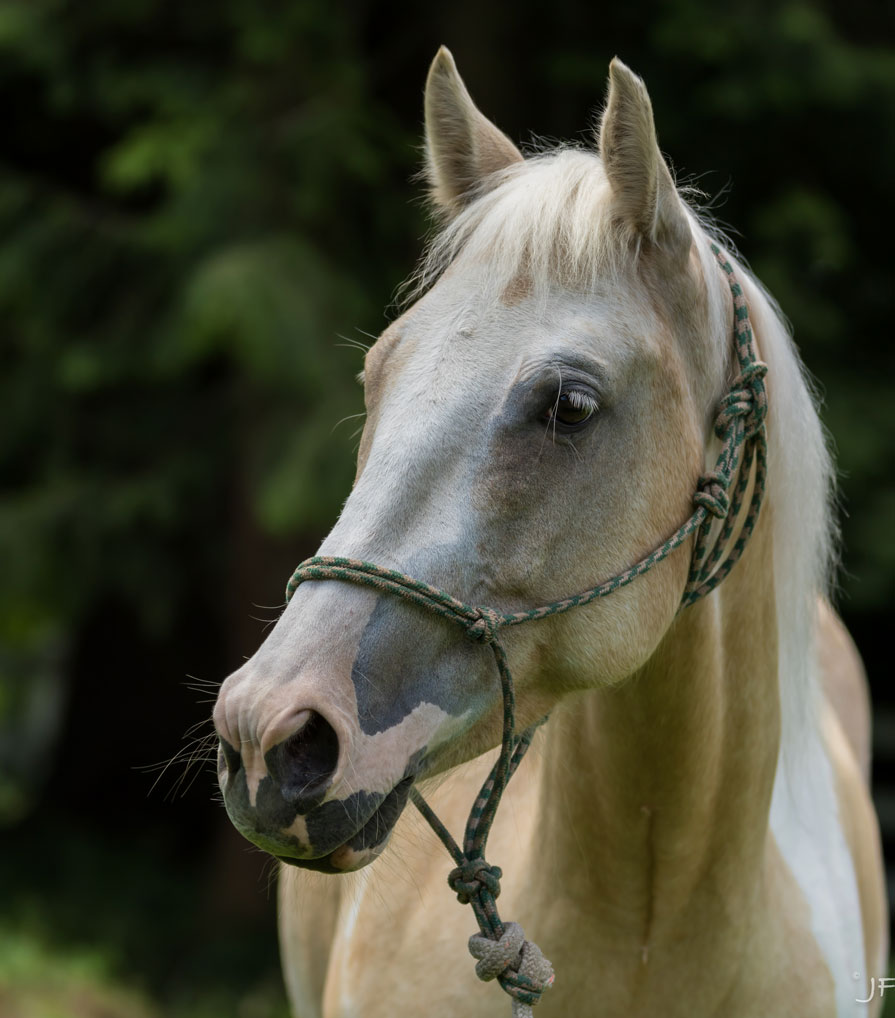 Jewel is a palomino & white Paint mare who came to SAFE in an emaciated condition with a severe parasite load, lice, a poor coat, overgrown hooves, and facial indentations from a halter that was too small for her. Jewel made a full recovery from her neglect and blossomed into a lovely young horse. Jewel did a great deal and she’s done very well in her lessons. She was very easy to start under saddle, thanks to all of the ground work and liberty training done at SAFE. Jewel and a young rider named Claire cliniced with Buck Brannaman and did exceptionally well. Jewel was ridden on a regular basis by her volunteer rider, and under the guidance of trainer Joel Conner, Jewel made tremendous progress as a riding horse. Jewel found her forever home with SAFE volunteer Julie V, who was kind enough to board her new horse right in the neighborhood so she’s never too far from our hearts.