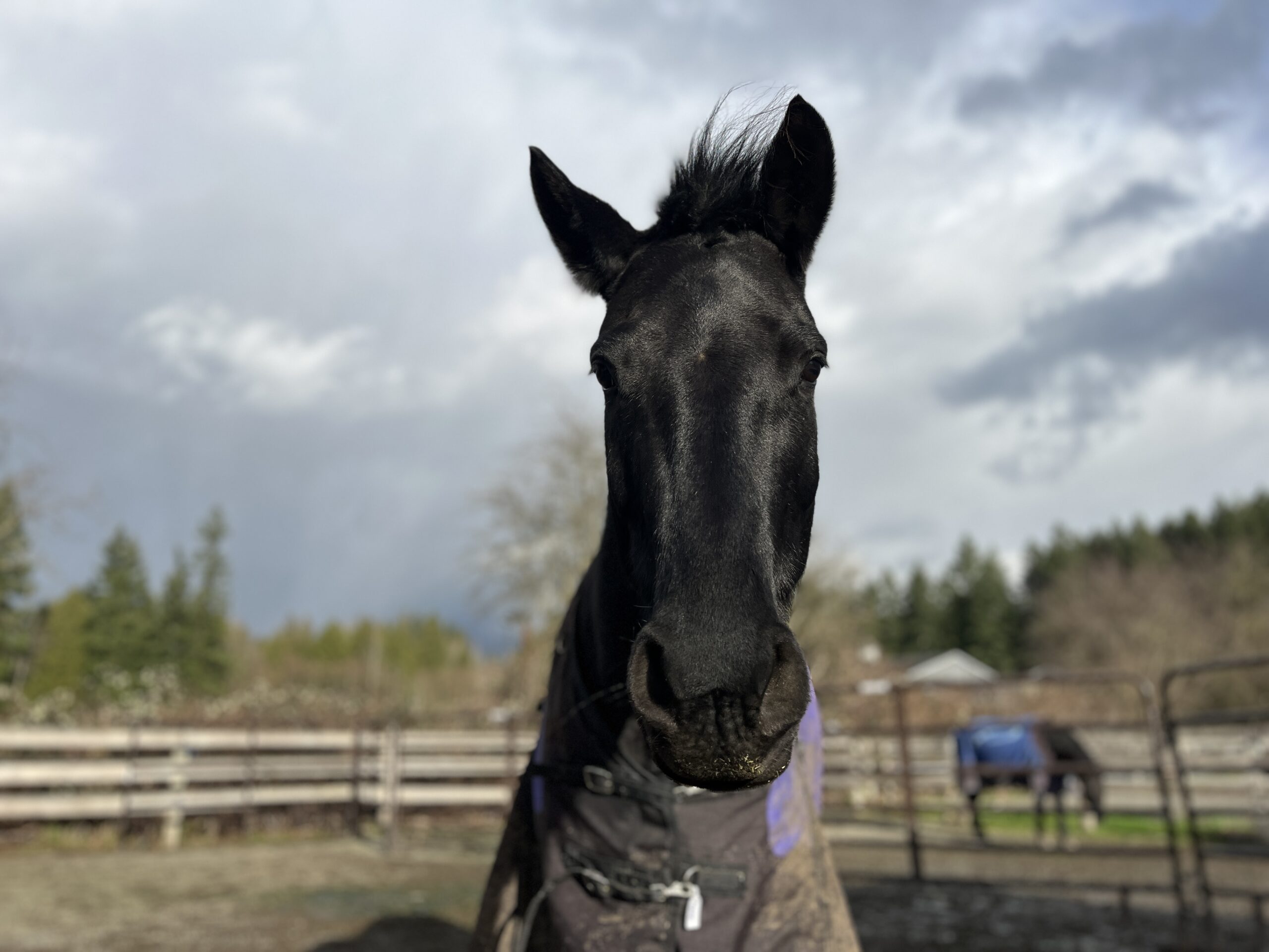 Sweet Blanche has been settling in at SAFE nicely, having a nice mellow (and quite mild!) winter. She and Dorothy love to kick up their heels in the arena together, and when she’s not hanging with her buddy, Blanche is always eager to greet you at the gate or the hay net. She really is one sweet mare. She took the time to pose for a few photos on a rare winter day, modeling how well purple looks on her shiny black coat (even though both were a little dirty, we still think she looks striking!) Contact us to hire Blanche for your next modeling gig!