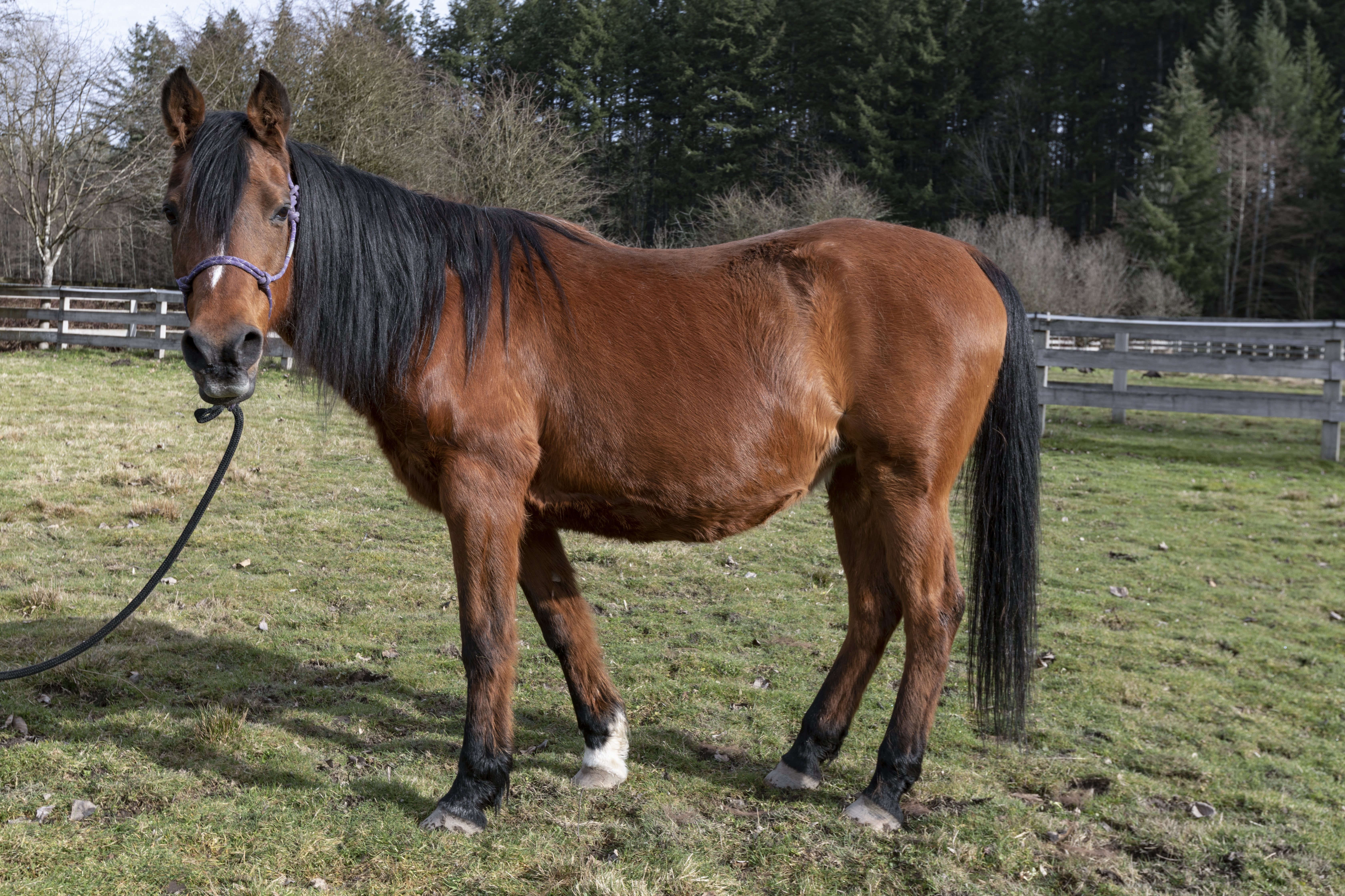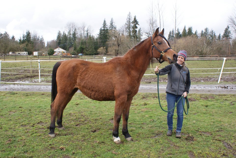 We are excited to announce that Marta is ADOPTED!! She is now living in a lovely home in Issaquah with a younger Arabian mare named April. Her adopter, Ginger, loves her sassy side and visited Safe Harbor a number of times to get to know her before finalizing the adoption. The two connected and we are thrilled that such a great match was made. In one of their final getting-to-know-each-other “dates”, Marta was walking “in time” with Ginger only taking a step when Ginger took a step. This was a huge change for a mare that could be on the pushy side. It was so cute to see her hook on and be happy with her human!!