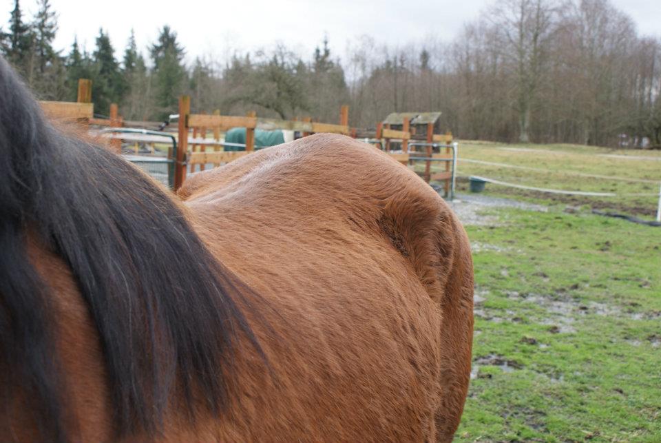 At the end of December, Marta had a dental with Dr. Fray of Pilchuck Veterinary Hospital. Marta has been dropping weight lately, and an oral exam revealed why. Once she was sedated, Dr. Fray found the beginning signs of Equine Odontoclastic Tooth Resorption and Hypercementosis (EOTRH). EOTRH is a painful dental disease that can occur in older horses. The disease is progressive and has no cure other than surgery to remove affected teeth in more advanced cases, but it appears that Marta’s case is not severe enough yet to warrant surgery.