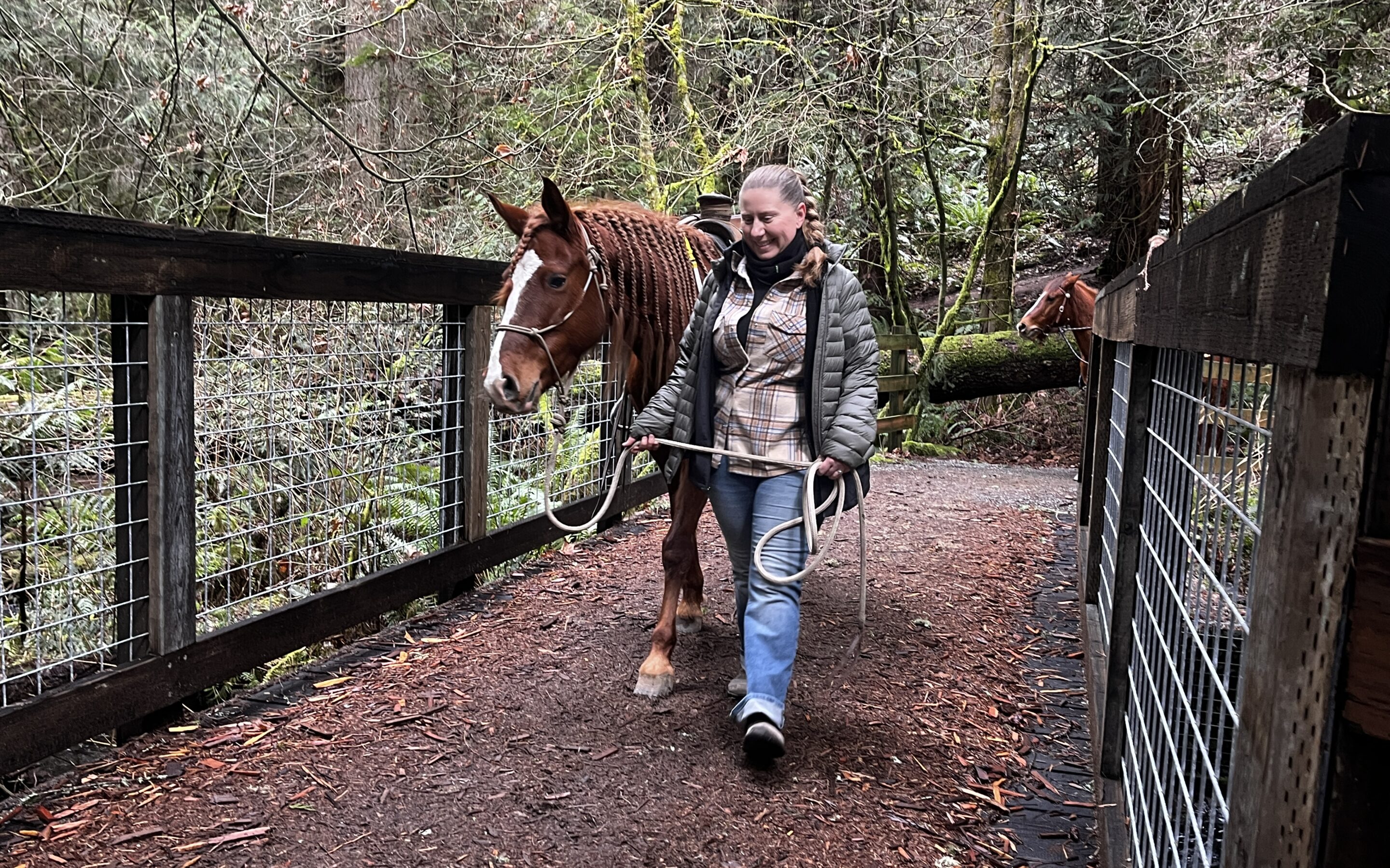 She accompanied Tiva, who was being ridden. At one point, we came across a bridge with quite a bit of running water rushing beneath. Tiva felt a bit uncertain leading the way, so Veronica stepped in to make the crossing first, which gave Tiva the confidence she needed to follow suit.